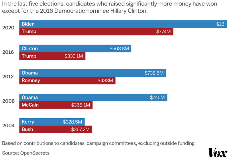 Vox například před časem zveřejnil graf, z něhož je patrné, že volby rozhodují do značné míry peníze od donorů. A v téhle statistice brutálně vyhrává Harrisová, v posledních dnech až poměrem 5 ku 1.