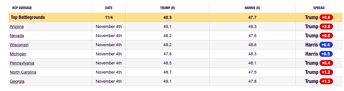 Nicméně i tak výsledky ve skutečnosti nemusí být ani blízko 270 - 268, protože statistická chyba se např. u Nate Silvera pohybuje u 3,1 procentního bodu, a historická odchylka průzkumů oproti reálným výsledkům ve swing states je podobná. To je ale zároveň hranice, ve které se podle agregátoru RealClearPolling pohybují předpovědi všechn swing states. Pokud by se zhouply všechny na jednu či druhou stranu, vítězný kandidát může mít klidně přes 300 volitelů.