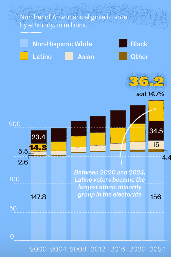 …. nicméně za postřeh stojí také, v poslední době vzrůstající, podpora Trumpa mezi hispánci, přesněji řečeno spíš hispánskými muži. Jak totiž napovídá tenhle graf z Le Monde, z nich se totiž od minulých voleb stala největší skupina nových potenciálních voličů.