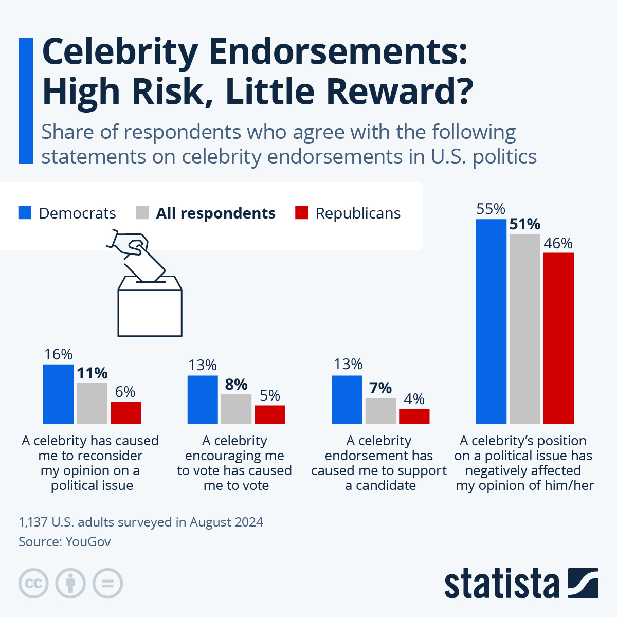 Jde hlavně o emoce a Trump v posledních hodinách před volbami získal cennou podporu od podcastera Joea Rogana, pár dní zpátky i od popkulturní star Jakea Paula. Podpora celebrit bezesporu vliv má, ale ne zas tak velký, jak by se mohlo zdát. Spíš je to podle dat od Statista riskantní hra pro samotné osobnosti, protože mohou přijít až o přibližně polovinu svých fanoušků.