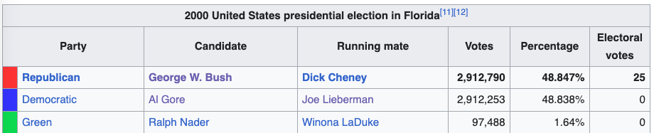 Nic těsnějšího v novodobé historii nebylo, tedy pokud nebereme v potaz volby v roce 1876, kdy Rutherford B. Hayes vyhrál o pouhý jeden hlas v electoral college.