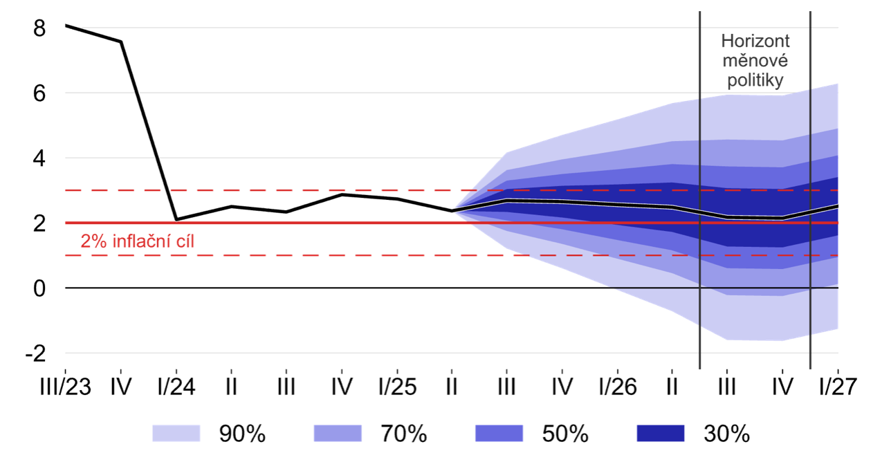 Podle letní prognózy ČNB (vychází 15.8.) zůstane inflace v horní polovině tolerančního pásma (tedy v pásmu 1–3 % nad dvojkou) minimálně až do druhé poloviny roku 2026. Očekává se, že v roce 2025 dosáhne průměrná inflace 2,6 %, v roce 2026 mírně klesne na 2,3 % a v roce 2027 pak zase mírně vzroste na 2,5 %. Tato hodnota je mimochodem ovlivněna i zavedením systému EU ETS 2, který v modelovaném scénáři centrální banky (29 EUR/t CO2) přinese primární inflační dopad ekvivalentní 0,4 procentního bodu (pp) a sekundární 0,2 pp. Při scénáři 57 EUR/t je ale modelovaný primární inflačního dopad 0,88 pp a sekundární dopad 0,3 pp. Pokud někteří tvrdí, že se EU ETS2 ve spotřebitelských cenách neprojeví, tak tým nejlepších makroekonomických analytiků v zemi si to nemyslí.