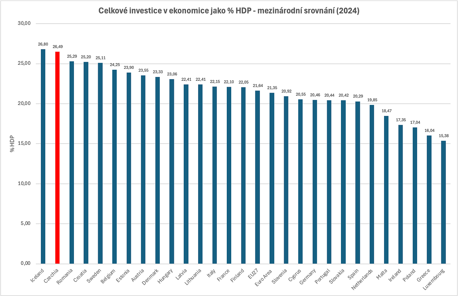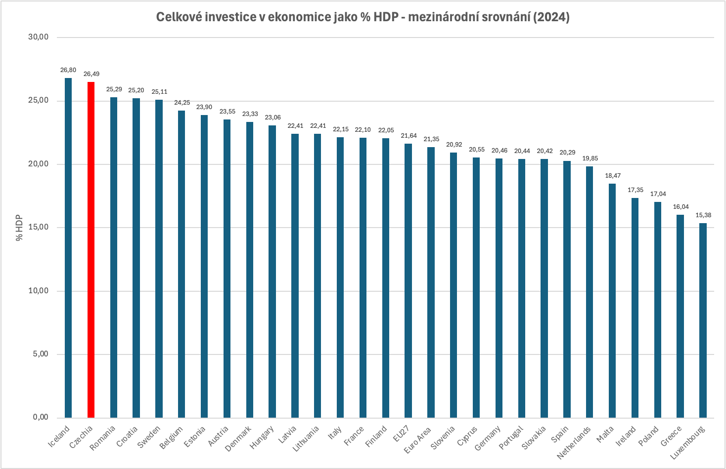 Mezinárodní srovnání v rámci Evropské unie ukazuje, že Česká republika rozhodně nepatří mezi investičně slabé ekonomiky. Naopak, s podílem celkových investic kolem 26 až 27 % HDP se dlouhodobě řadí mezi nejvíce investující země EU. Vyšší investiční míru dosahují zpravidla jen menší nebo konvergující ekonomiky, případně země s výraznými infrastrukturními programy. Česká pozice je ale strukturálně podmíněna – silná průmyslová orientace, exportní charakter ekonomiky a kapitálová náročnost výroby přirozeně generují vyšší potřebu fixních investic než v ekonomikách založených převážně na službách.