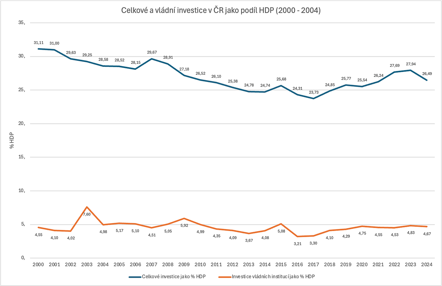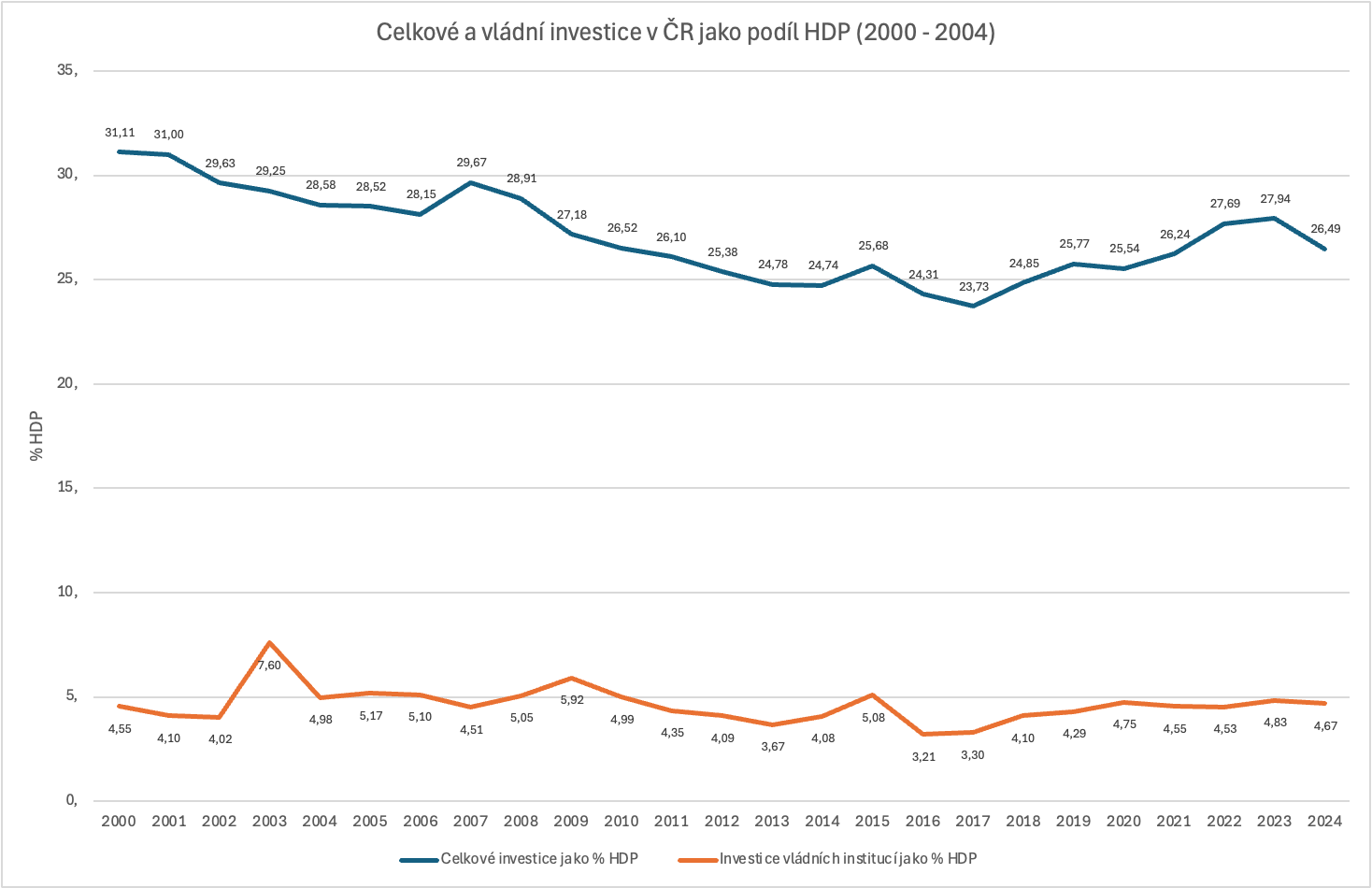 Graf níže zachycuje vývoj celkových a vládních investic jako podílu na HDP v letech 2000 až 2024. Na první pohled svádí k jednoduché interpretaci: V určitých obdobích investice rostou, v jiných klesají. A nabízí se otázka, která vláda „investovala více“ a která „méně“. Takové závěry je však třeba činit velmi opatrně.