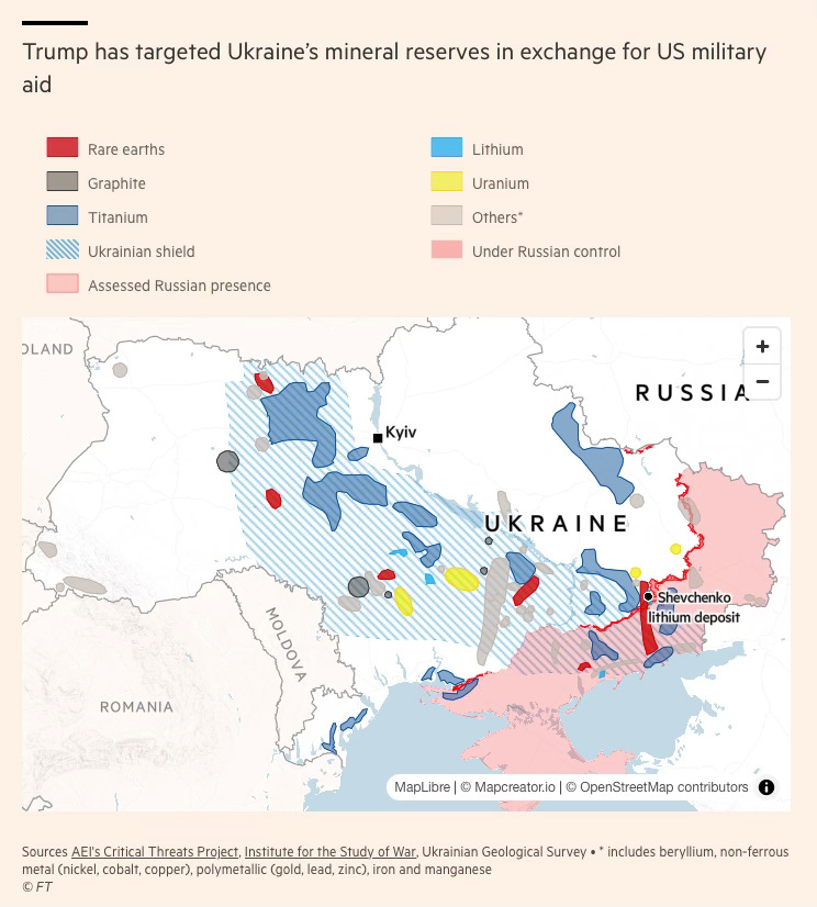V posledních týdnech byla média také plná spekulací o podobě plánované americko-ukrajinské „dohody o nerostných surovinách“, která měla odstartovat americkou diplomatickou snahu o dosažení mírového urovnání konfliktu. Uniklý pracovní návrh naznačoval, že Washington se nezaváže k přímé vojenské podpoře Ukrajiny, ale pouze vyjádří zájem „amerického lidu“ na „svobodné, svrchované a bezpečné Ukrajině“. Klíčovým bodem dohody měl být společný fond na obnovu země, do něhož by Kyjev odváděl příjmy ze státem kontrolované těžby surovin. Páteční vypjaté jednání v Bílém domě však skončilo předčasným odchodem prezidenta Zelenského a zrušením plánovaného podpisového ceremoniálu. Trump přesto nevyloučil budoucí uzavření dohody, kdy by k podpisu mohlo dojít je však momentálně nejasné.