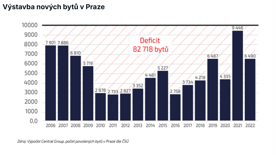Začneme Prahou. Jen mezi lety 2006 a 2022 se v hlavní městě akumuloval deficit více než 82 tisíc bytů, které bychom teď potřebovali.