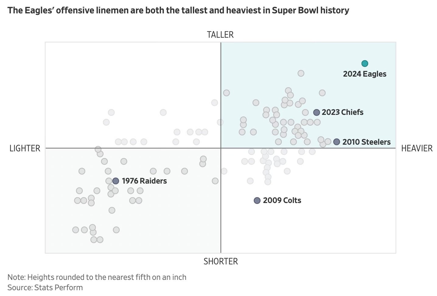Co bylo důvodem tak jednoznačného výsledku? Ofenzivní (i defenzivní) lajna Filadelfie. To jsou ti největší borci na hřišti, kteří zajišťují, aby měl quarterback čas rozehrát, nebo blokují, aby měl running back kudy proběhnout. Právě v osobních soubojích Eagles dominovali. A když říkám „největší,“ tak tím myslím nejvyšší a nejtěžší sestavu, která kdy v historii nastoupila do Super Bowlu.