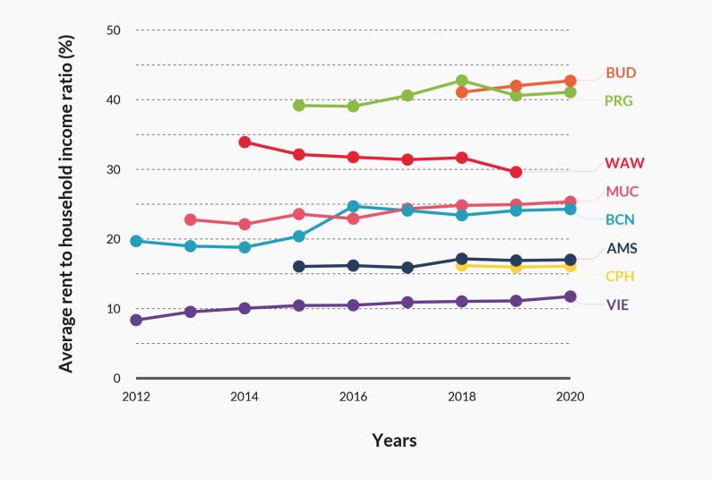 Máme nejméně dostupné vlastnické bydlení v Evropě. Na byt o 75 m2 je potřeba víc než 25 průměrných ročních příjmů, uvedlo Politico. Mizerně vycházíme z čísel ohledně dostupnosti nájemního bydlení, jak ukazuje graf z IPR.