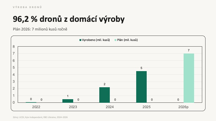 V roce 2022 byl obranný průmysl Ukrajiny odhadován na přibližně miliardu dolarů ročně. Do roku 2025 to bylo 35 miliard. V roce 2026 se čeká přes 50 miliard. Stovky nových výrobců dronů, systémů elektronického boje, raketové techniky, pozemních robotů. Jen přes inovační cluster Brave1 prošlo přes 2300 firem a pět tisíc technologických řešení. Tenhle průmysl nevznikl z grantů ani z pětileté strategie. Vznikl proto, že lidé umírali a někdo musel vymyslet, jak to zastavit.