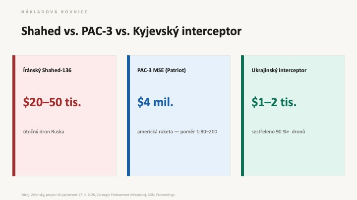Saúdská Arábie kontaktovala Kyjev přímo. Katar přímo. Emiráty přímo. Washington podobnou pomoc nezprostředkoval – ačkoliv to byly právě Spojené státy, kdo o pomoc požádal jako první: Zelenskyj ve svém projevu před britským parlamentem 17. března 2026 potvrdil, že 201 ukrajinských specialistů je nasazeno v zálivu a část zamířila do Jordánska chránit americké základny – na žádost partnerů, včetně Washingtonu. Čtyři dny předtím Trump řekl, že Zelenskyj je „posledním člověkem, od kterého potřebujeme pomoc.“ USA utratily v zálivu na vojenský hardware přes 23,5 miliardy dolarů – Patriots, THAAD, AWACS. Tohle vybavení státy Perského zálivu mají. Co nemají, je přes 44 000 sestřelených Shahedů – čtyři roky operačních dat, která žádný výcvikový manuál nenahradí. A znalost, jaký systém použít, v jaké situaci, za jakých podmínek a jak nevyčerpat zásoby munice dřív, než konflikt skončí. Tu má Kyjev.