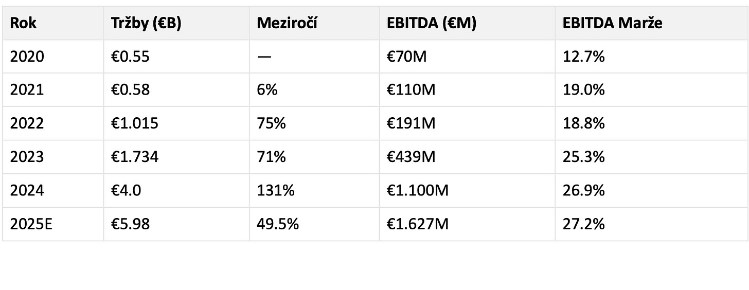 Čísla mluví jasně: CSG v posledních pěti letech zažila monumentální vzestup. Od skromných €550 milionů tržeb v roce 2020 se firma posunula na €4 miliardy v roce 2024, což odpovídá CAGR (složená roční míra růstu) 64,2 %. Ještě důležitější je dynamika posledních let: meziroční růst tržeb byl v roce 2022 +75 %, v roce 2023 +71 % a v roce 2024 +131 %, přičemž CSG zároveň reportovala růst operating EBITDA o +146 % a EBITDA marži 26,9 %.