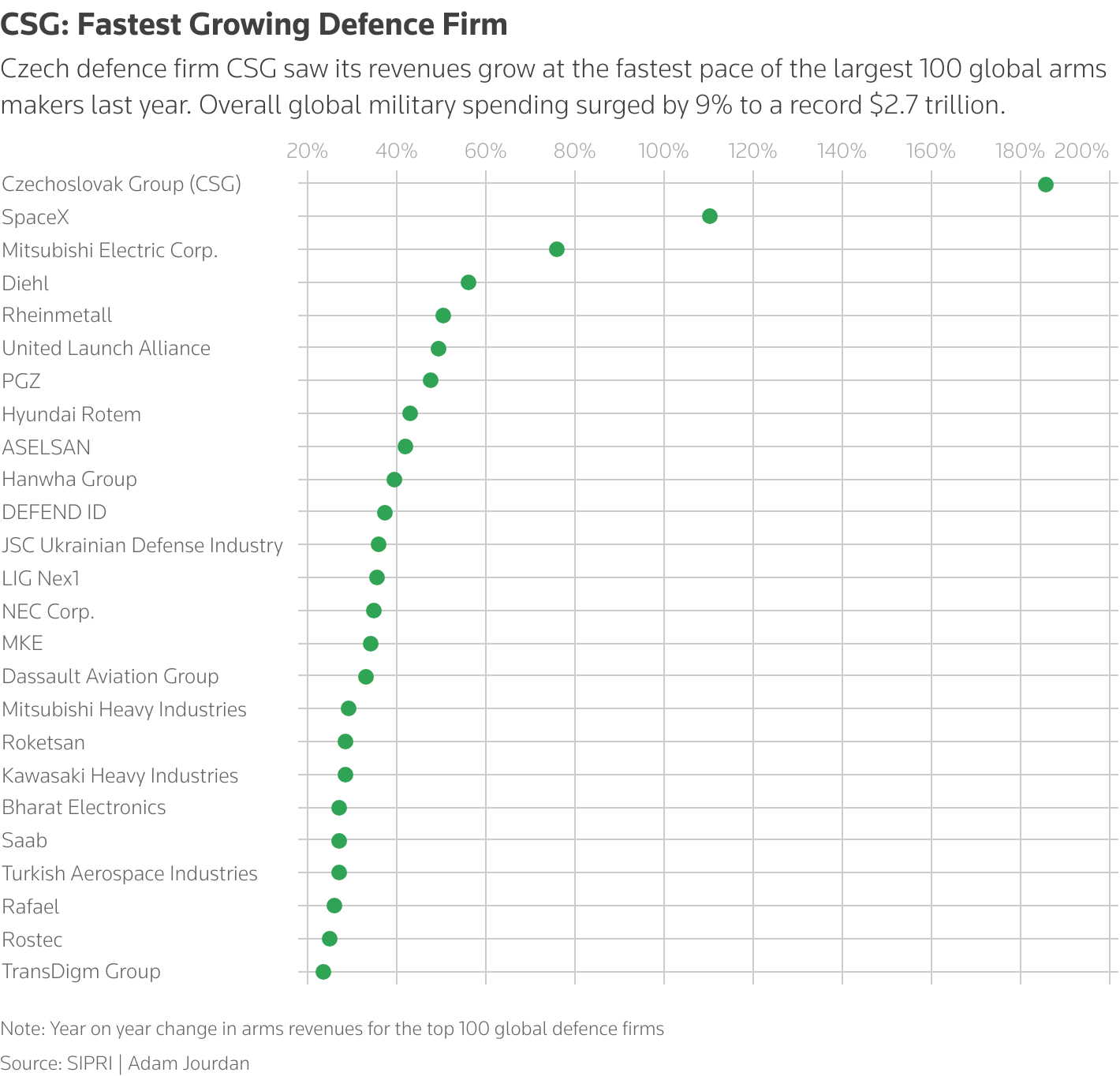 Důležité je zasadit růst do globálního kontextu: podle dat SIPRI (Top 100 Arms Producers) měla CSG v roce 2024 nejvyšší procentní růst „arms revenues“ ze všech firem v TOP 100, a tedy šlo o nejrychleji rostoucí defense firmu na světě v rámci tohoto žebříčku. To dává IPO narativ, který je pro velké fondy srovnatelný spíš s „global growth story“ než s lokálním českým příběhem.
