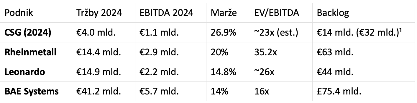 V absolutních tržbách je CSG menší než Rheinmetall (€9,8 miliardy) a výrazně menší než BAE Systems (€31,1 miliardy), ale v relativní ziskovosti je mimořádně silná: při €4,0 miliardy tržeb generuje €1,1 miliardy operating EBITDA, tj. EBITDA konverze je vysoce nadprůměrná. To je důvod, proč CSG v investor pitch může působit jako „midcap scale, largecap profitability“.
