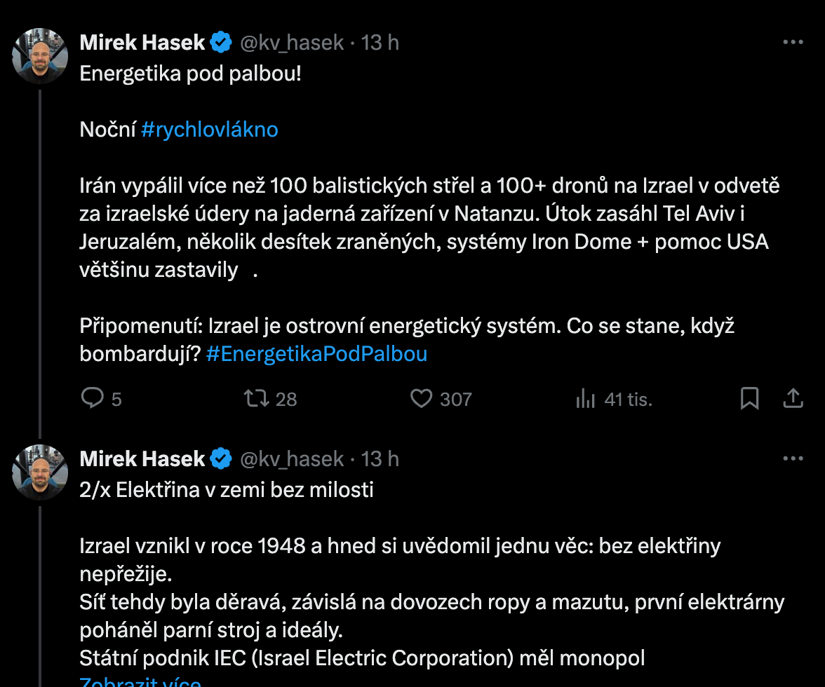 Miroslav Hašek v reakci na napětí mezi Izraelem a Íránem ve svém vlákně popsal, jak funguje ostrovní energetický systém Izraele a co se děje, když padají rakety.