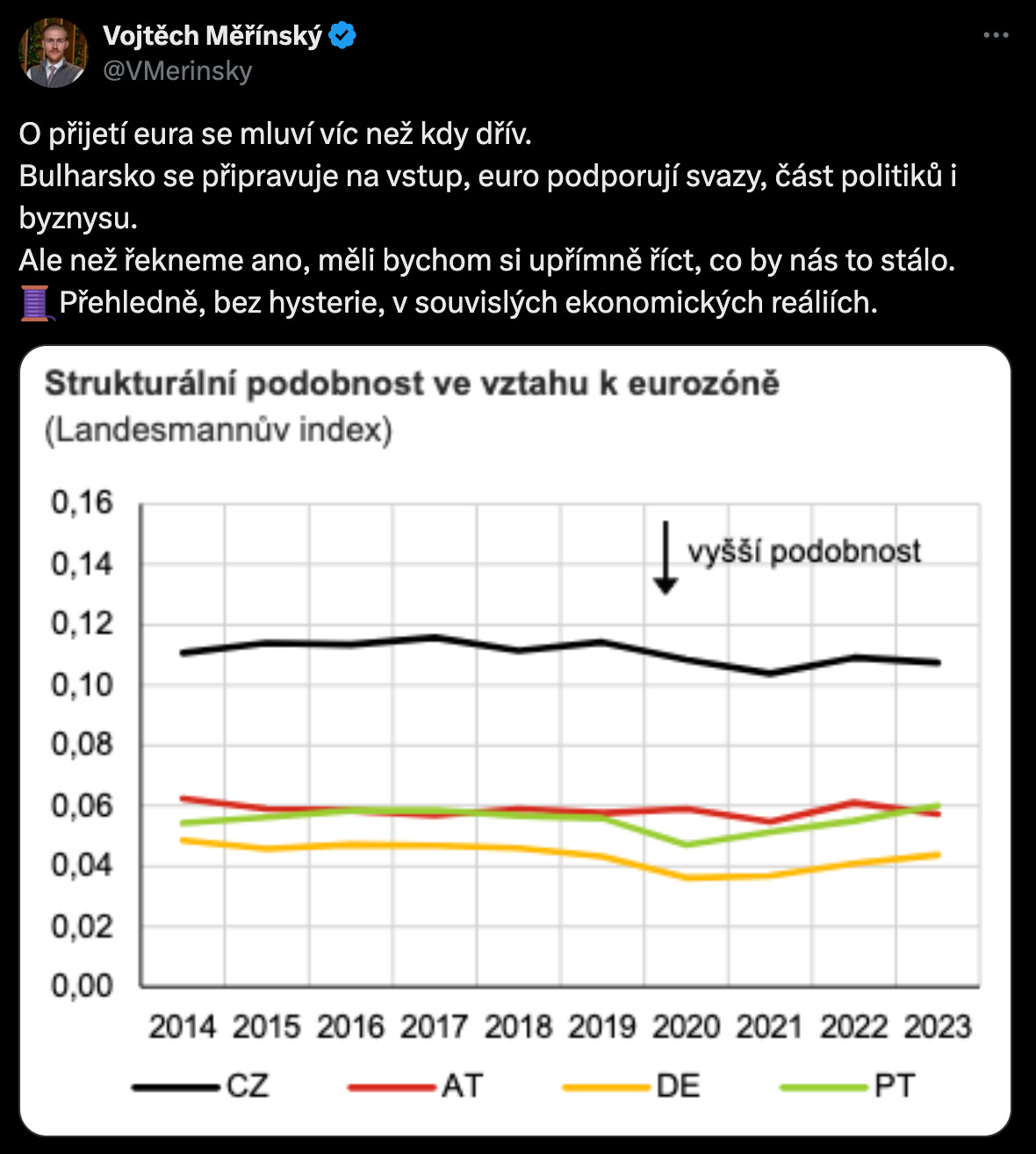 Je dobré si uvědomit, že Česká republika již dnes čerpá většinu obchodních a finančních výhod spojených s účastí v eurozóně – i bez eura. Jsme kapitálově i hodnotově integrovaní do evropského trhu, kdy exportní i vlastnické vazby na eurozónu jsou mimořádně silné.
