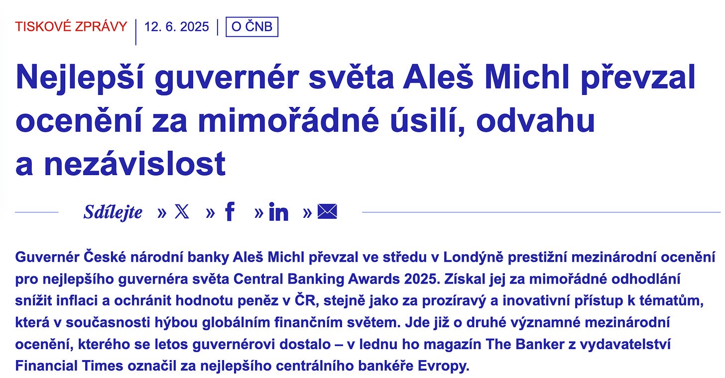 O tom, jakou váhu mají Michlova ocenění, se vyjadřovali mnozí. Připomeňme slova Petra Krále, exšéfa měnové sekce ČNB (jeho nástupcem se stal Petr Sklenář), která má na měnovou politiku a cílování inflace stěžejní vliv. „Od stejného časopisu dostal cenu pro nejlepšího ministra financí Miroslav Kalousek za nepříliš zvládnutou, byť dobře míněnou fiskální restriktivní politiku po roce 2010. A cenu pro nejlepšího ministra financí dostal i Andrej Babiš,” uváděl v rozhovoru z dubna. Takže to berme s velkou rezervou. Mimochodem, Král z ČNB na začátku roku odešel i z toho důvodu, že současná bankovní rada už prý neměla zájem doporučením měnové sekce naslouchat. Michl získal „prestižní mezinárodní ocenění pro nejlepšího guvernéra světa Central Banking Awards 2025” za „mimořádné odhodlání snížit inflaci a ochránit hodnotu peněz v ČR”, uvádí ČNB. A porota prý vyzdvihla i Michlovo úsilí „v péči o devizové rezervy nebo kroky vedoucí k efektivnějšímu hospodaření a fungování samotné instituce”.
