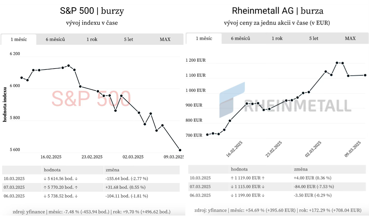 Evropské akcie letos zažívají výrazný růst a v porovnání s americkými trhy si vedou podstatně lépe – index Stoxx Europe 600 si od začátku roku připsal téměř 10 %, zatímco S&P 500 naopak ztrácí 2 %. Klíčovým faktorem je strategický posun evropských vlád směrem k větší vojenské soběstačnosti, což podporuje růst zbrojařských titulů jako Rheinmetall. Zvýšené výdaje na obranu navíc přinášejí širší ekonomický impuls, který by mohl oživit stagnující hospodářství. V Německu k optimismu přispívá i rozvolnění dluhové brzdy, což podpořilo růst akcií a výnosů státních dluhopisů.