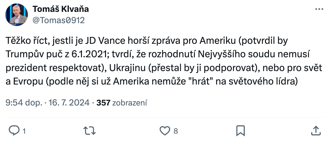 Velmi důležité pak bylo, že exprezident prokázal odvahu, vitalitu a nezdolnost, jež ostře kontrastuje s nemohoucností úřadujícího prezidenta. Aniž bych Trumpa jakkoli adoroval, faktem je, že v Pensylvánii prokázal leadership, což lidem obecně a Američanům zejména imponuje. Co udělá atentát na Trumpa s americkou předvolební kampaní jako celkem je ale těžké říct. Faktem ale je, že Donald Trump jede na „vítězné vlně“ a bude těžké jej z ní sesadit.