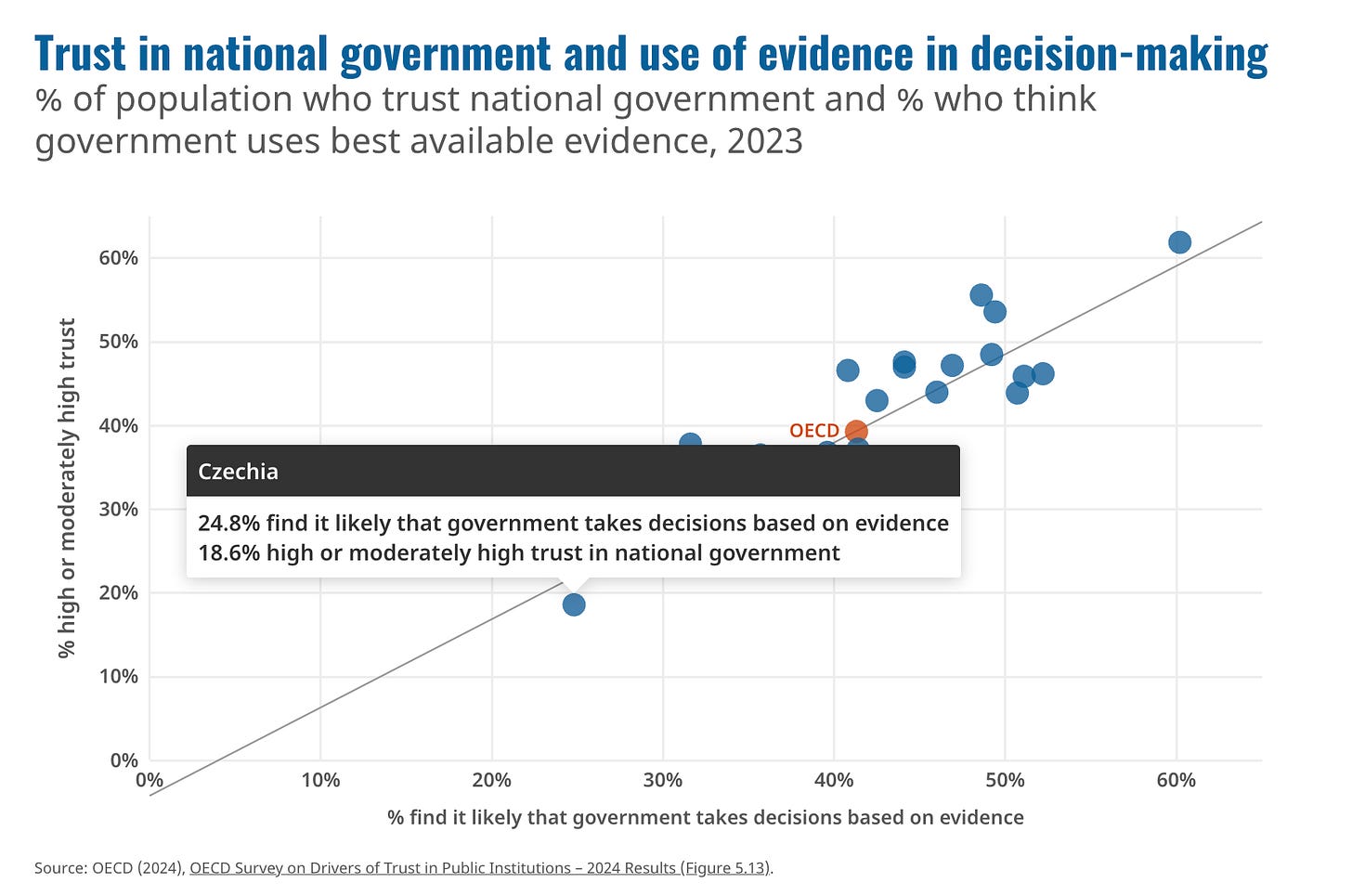 Podívejme se také na nová data OECD (za upozornění díky Evě Pavlíkové), která ukazují, jak lidé z jeho členských zemí důvěřují státu, institucím a veřejným činitelům obecně. Jak už to při podobných srovnáních bývá, je to dost tragický pohled. Jeden graf za všechny – suverénně nejméně ze všech států OECD věří Češi, že vláda dělá rozhodnutí na základě důkazů. Celá studie tady.