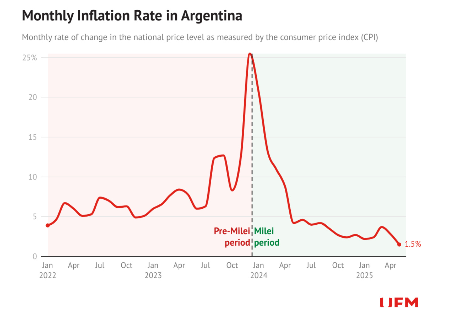 O to potěšující jsou nejnovější data z května 2025, podle kterých meziměsíční inflace (ukazující, o kolik se změnily spotřebitelské ceny oproti předchozímu měsíci) poklesla na 1,5 %, což je na české poměry mimořádně vysoké číslo, avšak v Argentině fenomenální výsledek, jelikož pod 1,5 % se meziměsíční inflace dostala naposledy v listopadu 2017. Pokud se také podíváme na průměrnou meziměsíční inflaci za posledních 10 let, činí průměr 4,4 %.