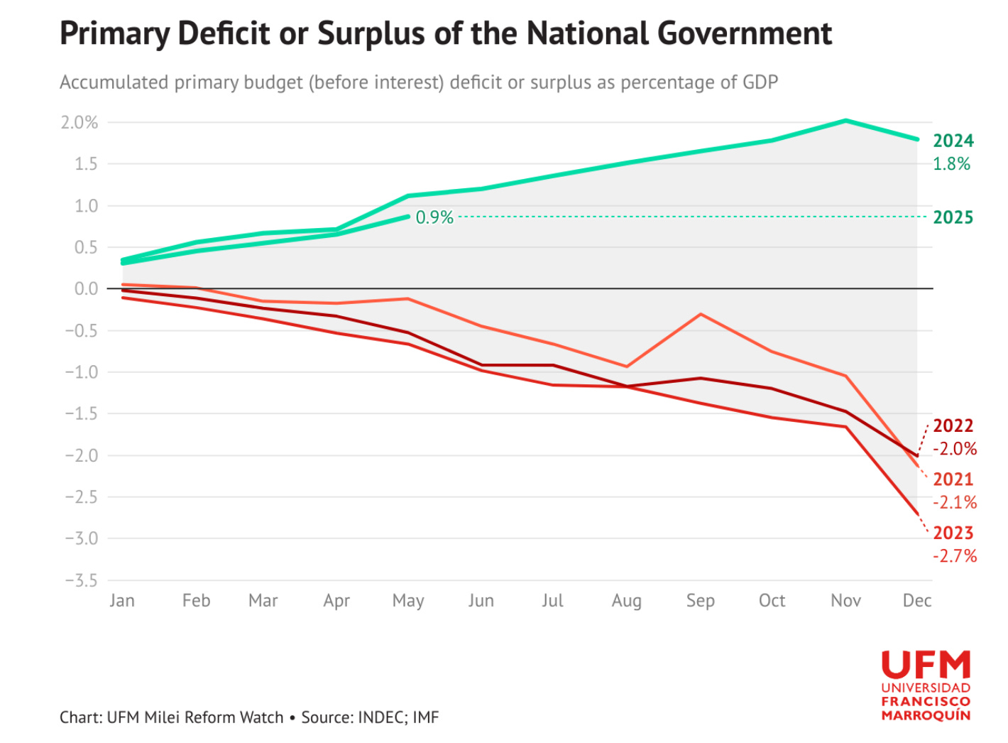 Cesta za záchranou Argentiny také spočívá ve fiskálních restrikcích. V celkovém pohledu lze konstatovat, že Argentina zažívá zlaté časy z hlediska fiskální disciplíny. Z hlediska primárního salda, tedy salda bez započtení úroků (a bez následků hospodaření předchozích vlád), se rozpočet ihned po nástupu Mileie dostal do zelených čísel.