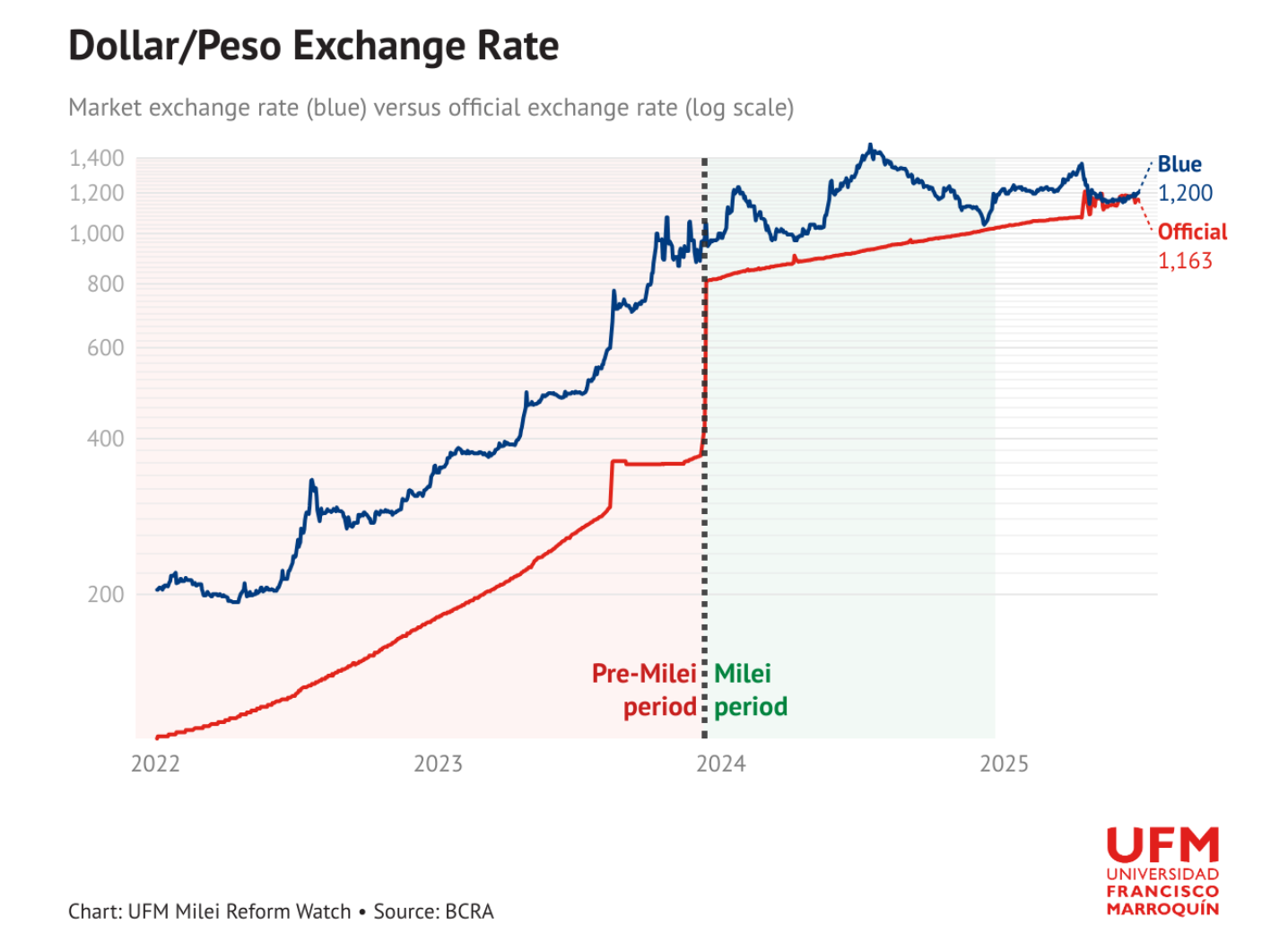 Javier Milei po svém zvolení prudce devalvoval peso a zavedl tzv. crawling peg, který spočíval v devalvaci oficiálního (červeného) kurzu pesa o 2 % každý měsíc. Jedná se o systém, který můžeme vnímat jako jakousi třetí cestu vedle fixního a plovoucího kurzu. Společně s oficiálním kurzem také existuje kurz neoficiální („Dólar blue“), který vznikl v roce 2001 jako důsledek tvrdých vládních restrikcí používání dolaru v argentinské ekonomice. Zajímavostí je, že černý trh je v Argentině tak populární, že kurz „modrého dolaru“ je pravidelně zveřejňován jako paralelní kurz s kurzem oficiálním.