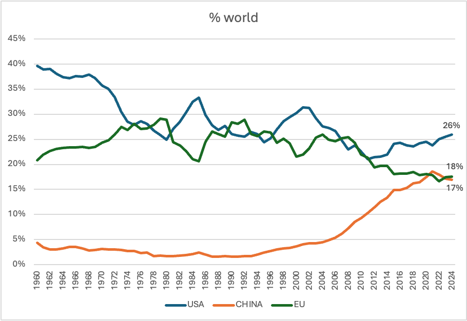 Na začátku tisíciletí měla EU ještě zhruba 22procentní podíl, což si udržela i během prvního desetiletí. Od té doby do roku 2024 ale klesla k 18 procentům. Spojené státy měly opačný vývoj, když z 20 procent v roce 2000 posílily na 23 procent v roce 2010. Jenže odtud se zvládly do roku 2024 dostat k 26 procentům. Úplně jinou rychlost nabrala Čína, která ze 4 procent na přelomu tisíciletí vyšplhala za 24 let na 17 procent. Význam Evropy a její schopnost podílet se na světové ekonomice stále klesá.