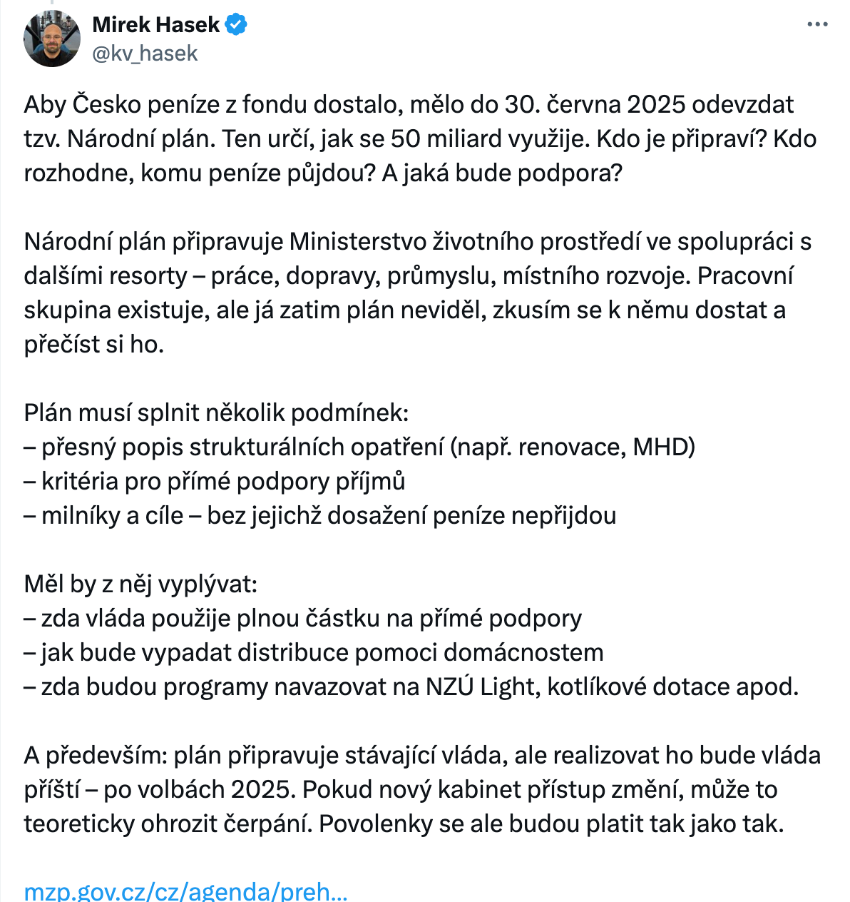 Ačkoliv ETS2 začne platit (v lepším případě) za necelé dva roky, lidé netuší, co je čeká – a stát s nimi nijak nekomunikuje. Chybí jakékoliv opravdové dopadové studie a modelové příklady. Je s podivem, jak málo informací máme k Sociálnímu klimatickému fondu, do kterého výnosy z povolenek půjdou. Z něj má Česko čerpat v letech 2026 až 2032 asi 50 miliard korun. To není moc velká částka, na to, že veškerá přímá (skrze dávky) i nepřímá (dotace) podpora má zřejmě pocházet z něj. Zajímavě o Sociálním klimatickém fondu na X referoval Mirek Hašek. Doporučuji jeho vlákno přečíst.