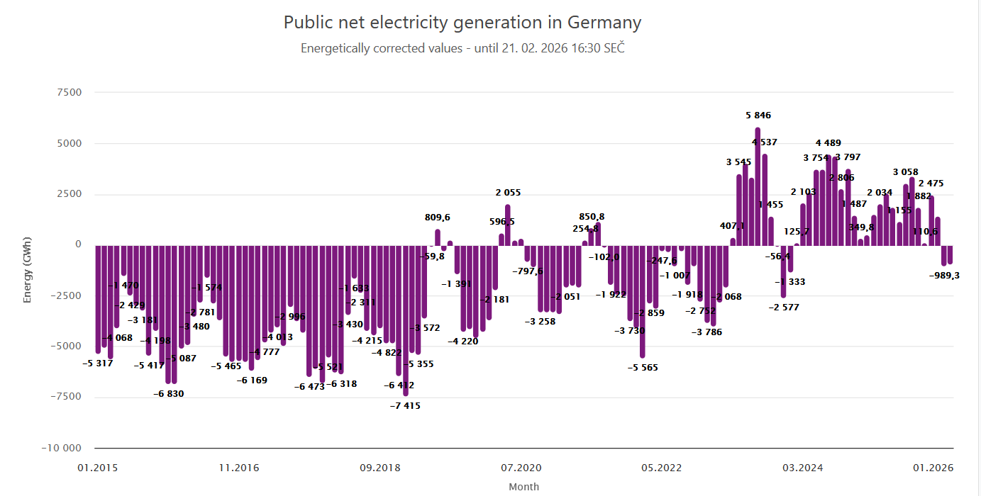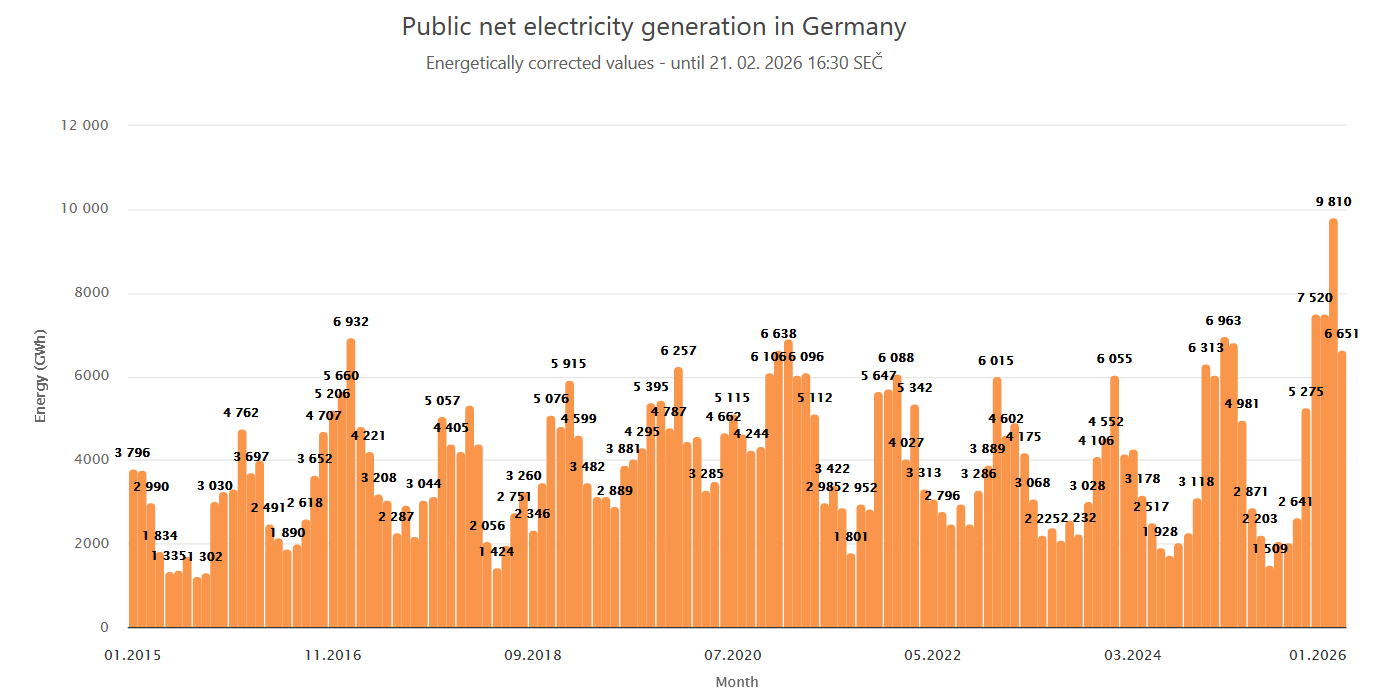 Pokud už však rozmotáváte drátek na klimaticky neutrálním šampusu, zase ho v klidu utáhněte. Německo od listopadu spaluje na elektřinu rekordní množství plynu. Naprosto bezprecedentní byl v tomto ohledu leden, kdy německé plynovky vyrobily téměř 10 000 GWh. Únor zatím vychází čistou aproximací na bezmála 9 000 GWh.