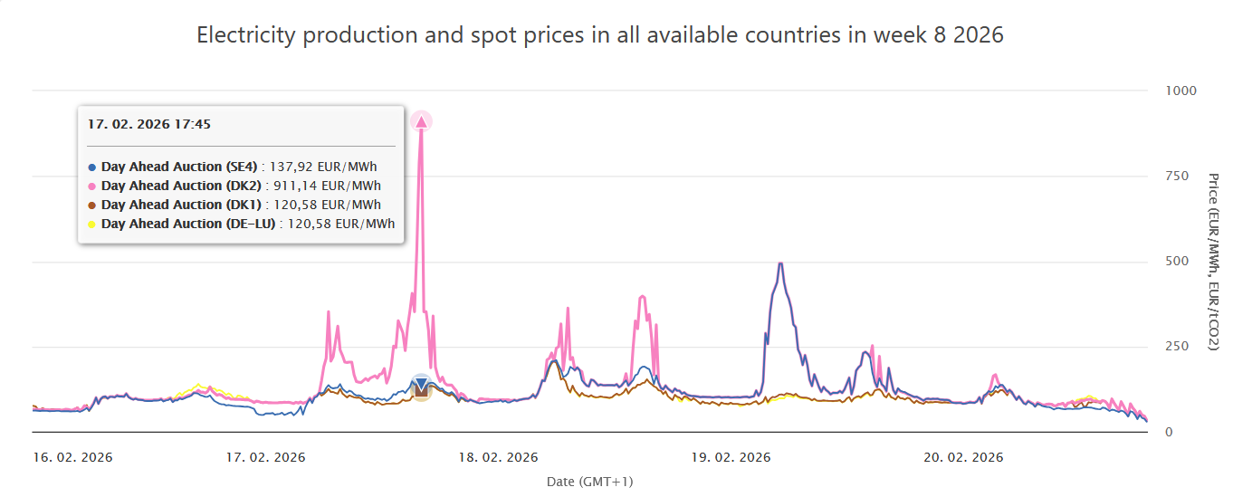 V úterý 17. února 2026 v 17:45 zasvítila na denním trhu v dánské obchodní zóně DK2 nejvyšší cena od roku 2010 a já jsem přesvědčen, že v tom měl prsty právě nějaký fanda do oblíbené německé značky sportovních automobilů. Jak jinak si vysvětlit, že po zaokrouhlení činila přesně 911 eur/MWh?