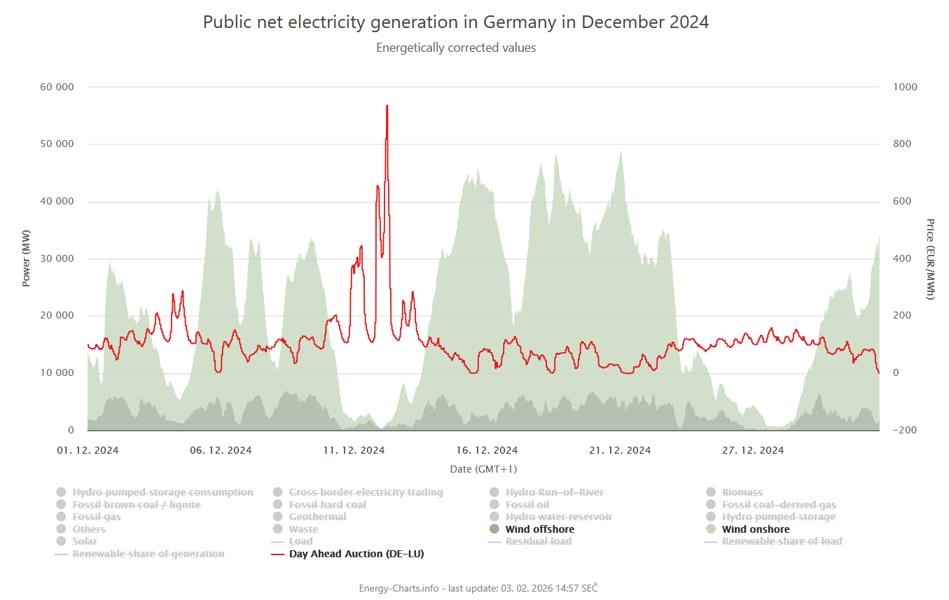 Tak oproti němu je ta aktuální doslova „eine Traumheizperiode“, a to navzdory extrémně nízkým teplotám. Až na krátkou a nepříliš významnou epizodu na začátku prosince foukalo v podstatě pořád, a to drželo ceny až nezvykle nízko.