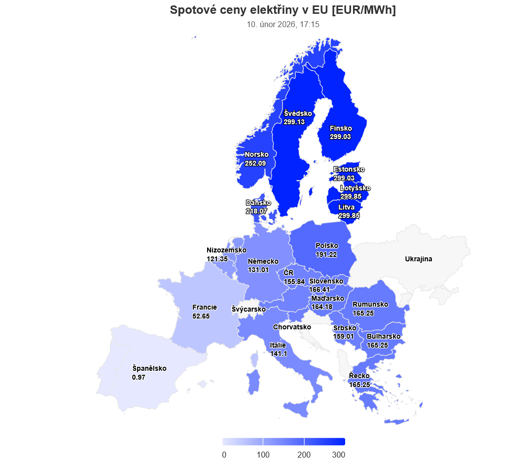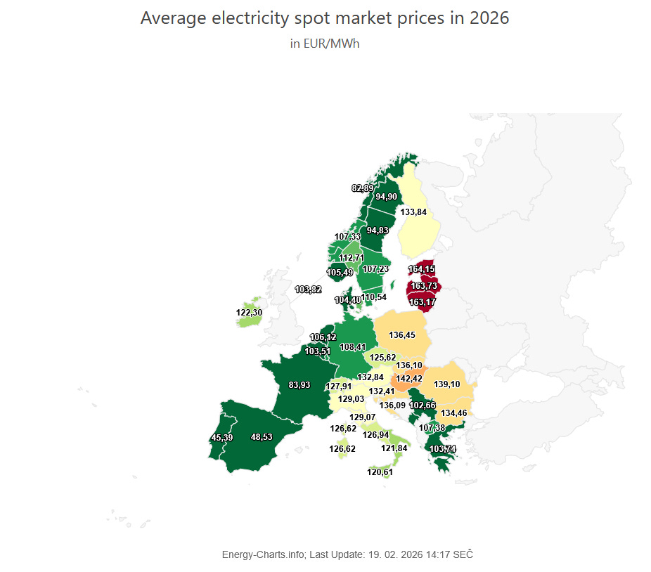 Naproti tomu leden a větší část února 2026 přinesly úplně jiný obrázek: Pyrenejský poloostrov suverénně nejlevnější, Skandinávie včetně severních zón neobvykle drahá (v čele s Finskem, které se ocitlo na úrovni Balkánu) a Pobaltí suverénně nejdražší. Absolutní výše cen velmi vysoko – 116,38 eur/MWh, tj. nárůst o více než čtvrtinu. Mrazy na několika místech atakovaly teplotu tuhnutí ruské vodky.