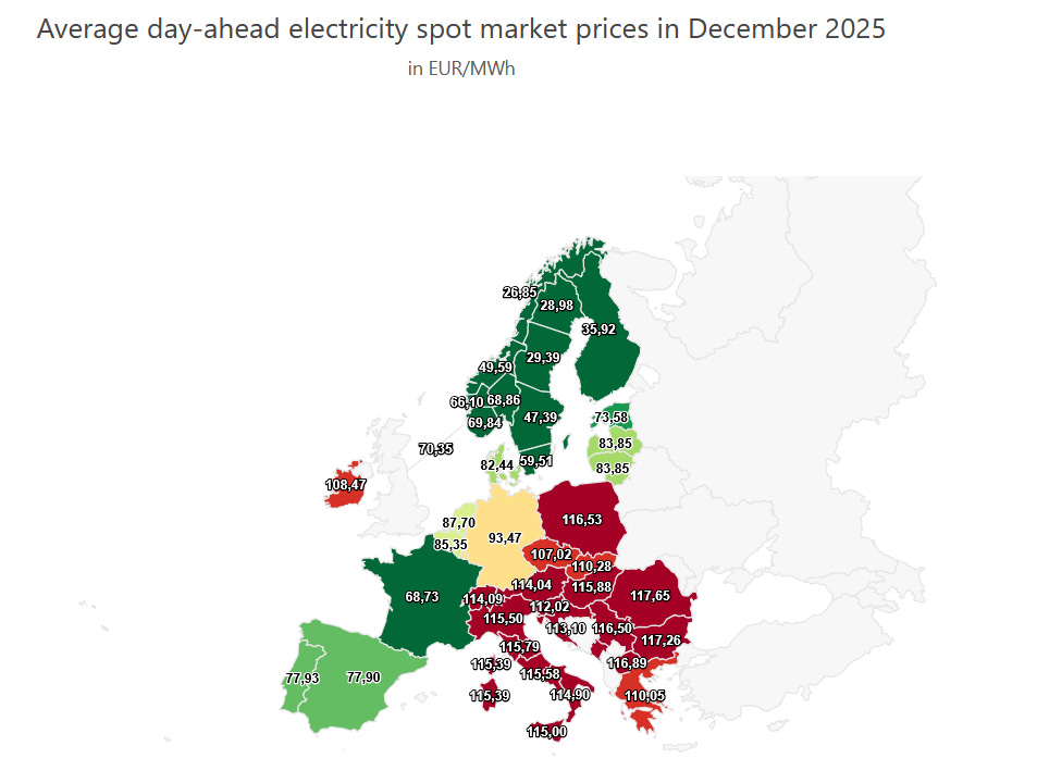 Na úvod musím klausovsky zvednout obočí nad tím, jak se situace vyvíjela v čase. Prosinec jako by patřil do úplně jiné zimy! Skandinávie nejlevnější, Estonsko mírně pod úrovní Pyrenejského poloostrova, Balkán a Itálie nejdražší. Absolutní výše cen velmi nízko – celkový průměr 92,18 eur/MWh. Teploty mírné.
