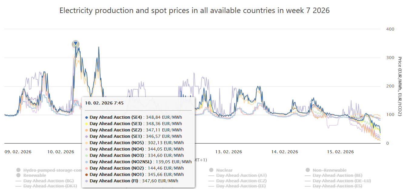 V únoru kvůli Auroře zažila Skandinávie něco dosud nevídaného: suverénně nejvyšší ceny v celé Evropě. „Tři sta z místa“ okusily dokonce i severní zóny Švédska a Norska, kde spotřebitelé dosud vůbec netušili, že se za elektřinu platí, protože byla skoro zadarmo.