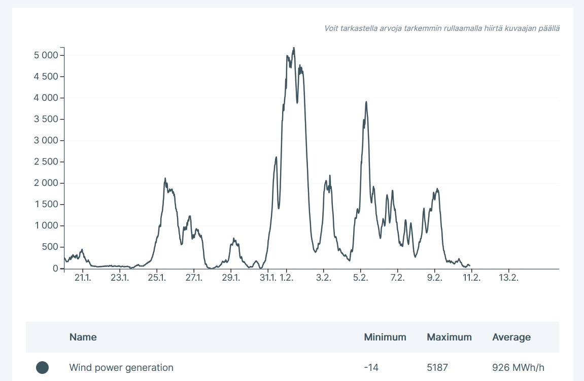Co tak hrozného se ve Finsku stalo? Nic moc, prostě jenom mrzlo a finská energetika na to kupodivu nebyla tak docela připravená. Při nejtřeskutějších mrazech dokonce fyzicky zamrzly větrníky a v několika okamžicích dodávaly záporný výkon! Vlastní spotřeba na hydrauliku, pohyb gondoly či odmrazování sice bývá za normálních okolností zanedbatelná, když se však vrtule nemohou ani hnout, klidně může být výsledkem veškerého snažení větrné energetiky i minus 14 MW jako na konci ledna.