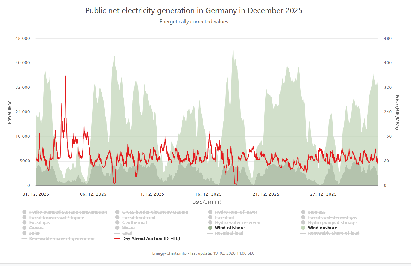 Od začátku roku 2026 pak dokonce v Německu fičelo tak, země po dvou letech poznala, jaké je to být čistým exportérem elektřiny… Ceny pak navzdory nebývalým mrazům stouply jen velmi mírně.