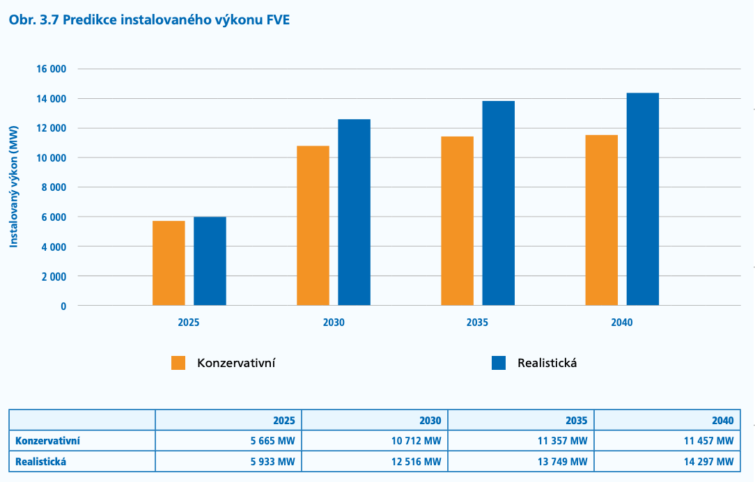 Stát ovšem počítá s velkým rozvojem kapacit. ČEPS předpokládá, že už v roce 2030 bude (nehledě na to, zda je odhad konzervativní nebo „realistický“) množství instalovaného výkonu FVE okolo dvojnásobku oproti stavu v příštím roce. Do 2030 má být postaveno dalších 6-10 GW FVE a tyto investice v řádu stovek miliard korun se předpokládají od soukromých subjektů.