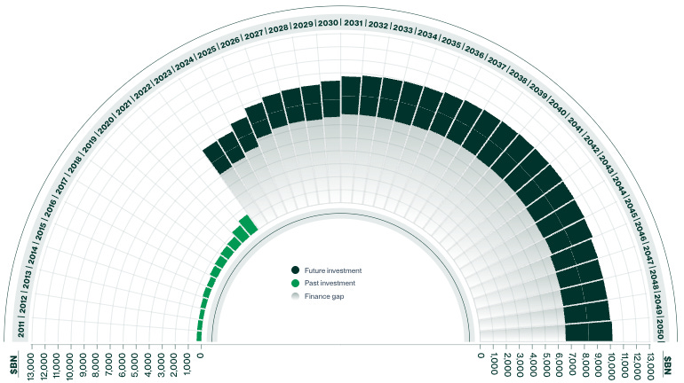 Aby svět splnil cíle Pařížské dohody, museli bychom mezi současností a rokem 2030 investovat do zelených řešení ročně o 6 bilionů dolarů navíc. Vychází to ze studie, kterou vypracovala A&O Shearman. Pro lepší představu, 6 bilionů dolarů je asi 6 % ročního HDP celého světa. Tenhle graf mluví tak nějak za vše.