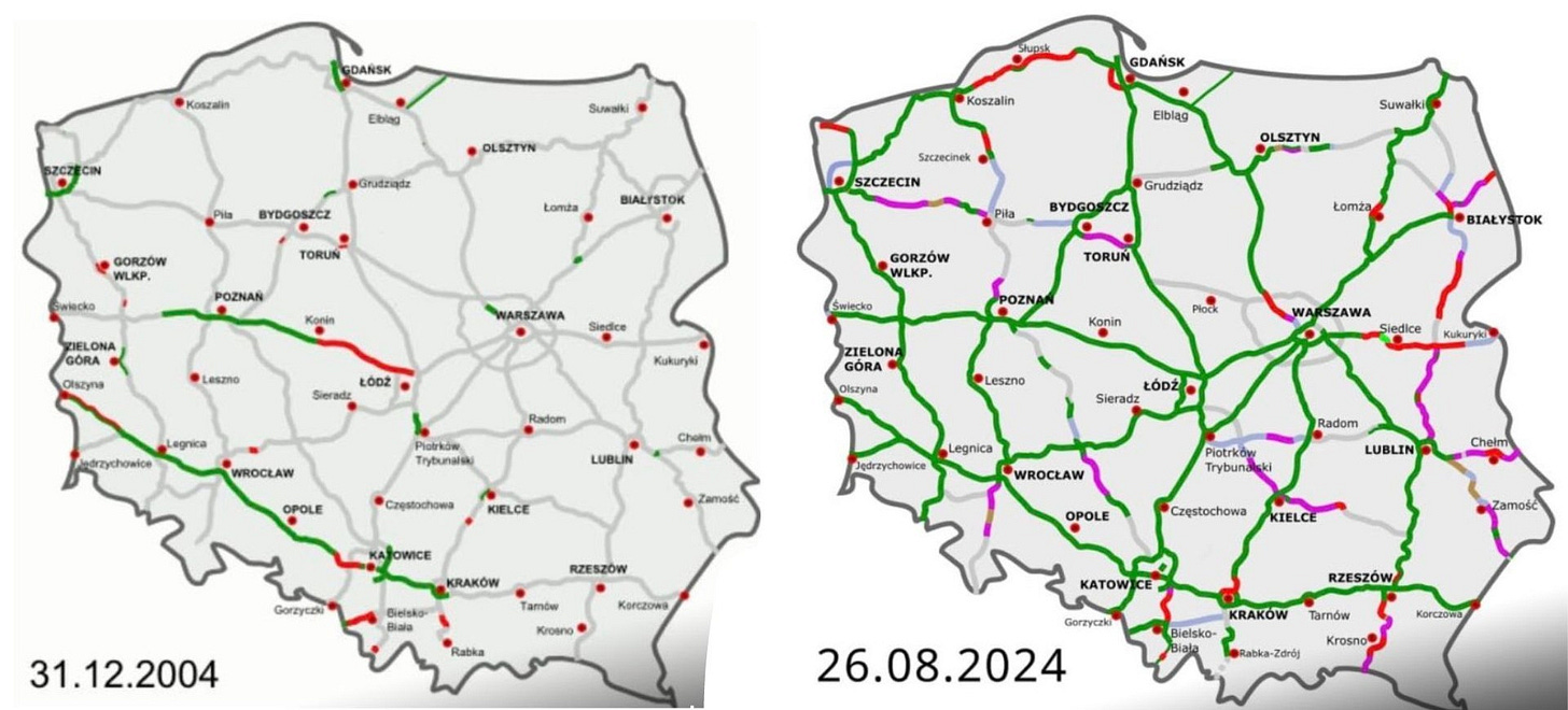 Je toho ale mnohem více. Začněme tématem, které v souvislosti s Polskem zmiňujeme opakovaně. Tento obrázek, který ukazuje vývoj dálniční sítě v Polsku za dvacet let, už nejspíš znáte…