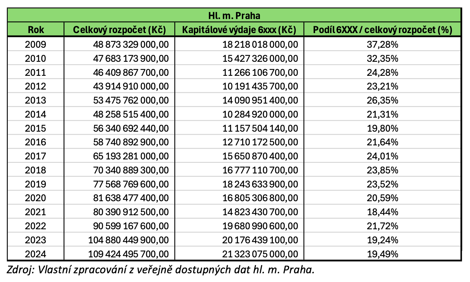 V tabulce jsou data o schváleném rozpočtu Prahy, tedy rozpočtu zamýšleném, které schválilo zastupitelstvo (tím pádem se není možné vymlouvat na fakt, že zastupitelé chtěli investovat více, ale realita byla proti).