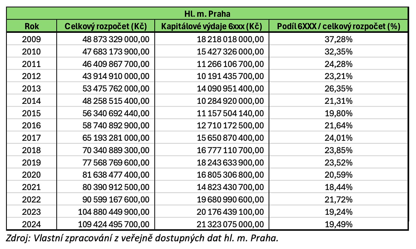 Podíl kapitálových výdajů (6XXX) na celkových výdajích rozpočtu Prahy dlouhodobě klesá. V roce 2009 tvořily kapitálové výdaje ještě 37,28 % celkových výdajů. Poté ale následoval pokles: v roce 2011 už jen 24,28 %, v předcovidovém roce 2019 to bylo 23,52 % a v roce 2024 činil podíl kapitálových výdajů již pouze 19,49 %.