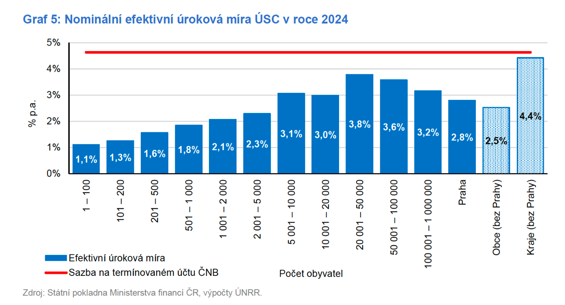 No ale tak obcím peníze zhodnocují, napadne vás. Ani to není pravda. Opět se podívejme na graf z dílny Národní rozpočtové rady. Na obrázku vidíme, že drtivá většina obcí dosahuje u svých úspor velmi nízkého zhodnocení, které nepokrývá inflaci. Je to především proto, že prostředky jsou kumulovány na běžných účtech nebo obdobných bankovních produktech. Přitom mnoho ekonomů upozorňuje na to, že termínovaný účet státní pokladny vedený v České národní bance je pro obce dostupný bez jakýchkoliv bariér a nabízí velmi nadprůměrné zhodnocení v porovnání s trhem. Například v roce 2024 to bylo 4,6 % p.a. Slovy klasika: „Nechci se nikoho dotknout, ale kdo z vás to má?“