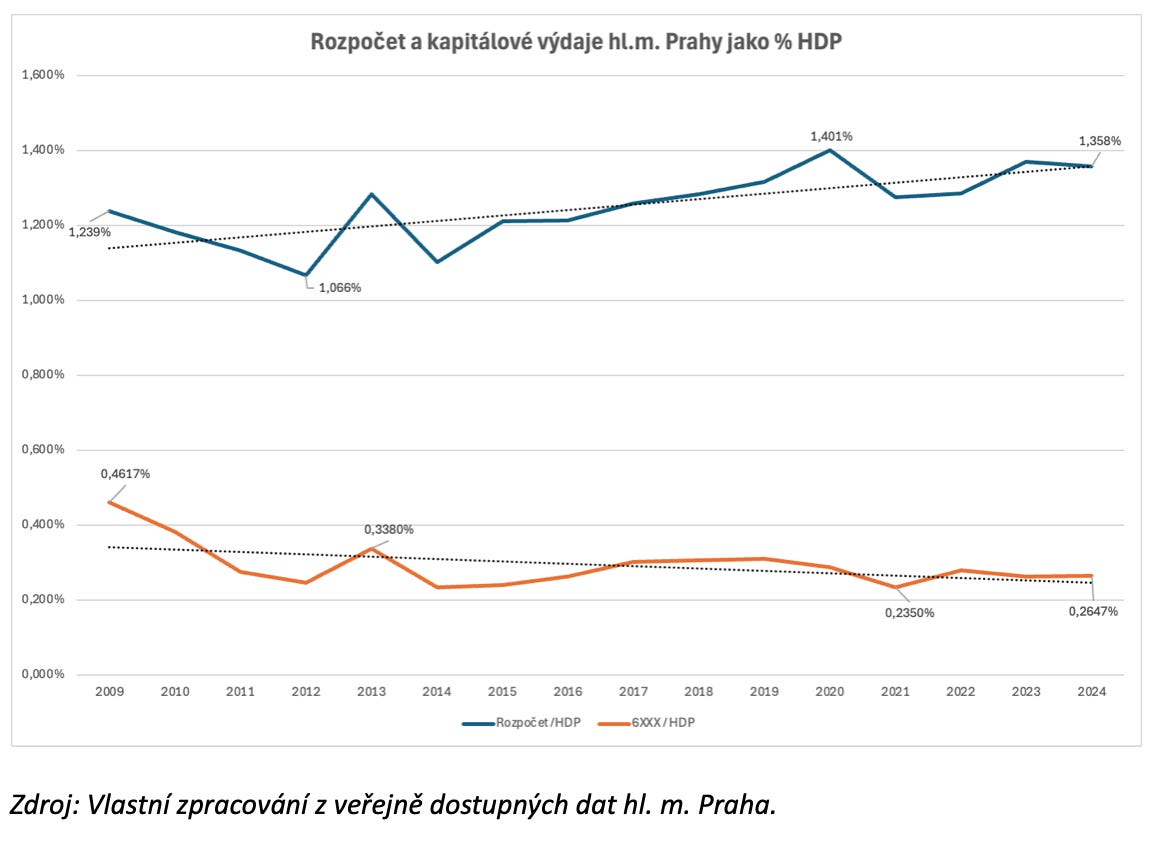 To, že „obce sedí na penězích“, se dá snadno odbýt argumentem, že jde přeci hlavně o malé obce. Jenže obdobný trend je patrný i v Praze – a právě proto je Praha nejdůležitější případová studie. Metropole totiž není obec s malým úřadem, je to nejbohatší samospráva v zemi, s nejlepším know-how v administrativě, nejrozsáhlejšími odbory úředníků a největšími investičními potřebami a možnostmi. Přesto investuje relativně méně než dříve.