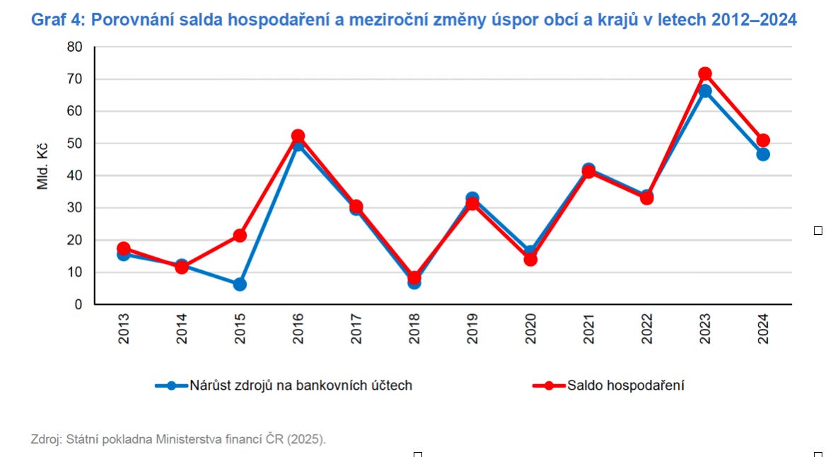 Obce často mluví o tom, že „úspory“ jsou základem budoucích investic, na které si obec musí našetřit. Jak ukazuje následující obrázek Národní rozpočtové rady, realita je o dost smutnější: Mezi lety 2013 a 2024 dosáhly obce a kraje kumulativního přebytku hospodaření 384,1 mld. Kč. Z této částky šlo 358,2 mld. Kč na bankovní účty. To znamená, že pouhých 25,8 mld. Kč (přibližně 6,7 % všech přebytků) bylo použito jiným způsobem než k navýšení zůstatků na bankovních účtech, a to zejména ke splácení půjček (na investice). Jinými slovy: Většina přebytků se proměnila v úspory, nikoliv v investice nebo jiné smysluplné využití. Dochází tedy k tomu, že: