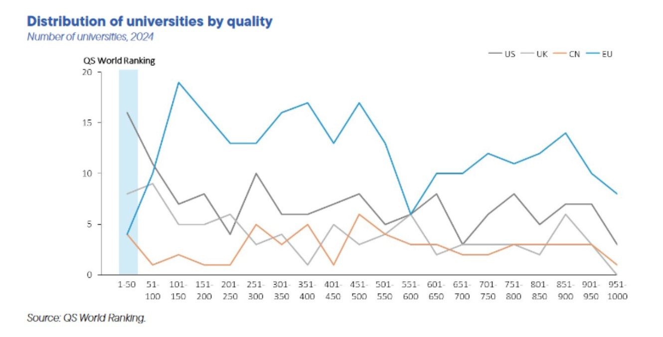Jistý potenciál značí také graf kvality univerzit. Evropa je místem pro špičkové vzdělávání, jen nesmíme usnout na vavřínech. Čínští studenti se v tuhle chvíli jezdí učit na západ, ale velmi brzy to může být naopak.