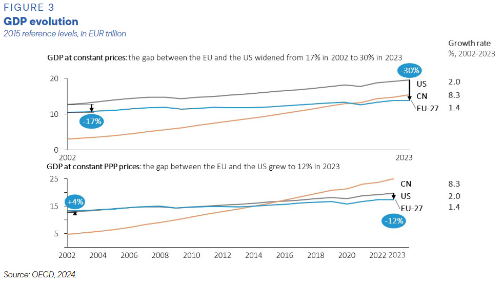 Paradoxní je, že v zásadě Draghi staví na problémech, o kterých v Insideru mluvíme dlouho a opakovaně. Jenže když je dáte na jednu kopu, vytváří to opravdu děsivou mozaiku. Hned v úvodu zprávy píše, že „EU vstupuje do prvního období ve své historii, kdy ekonomický růst nebude podpořen rostoucím počtem obyvatel. Do roku 2040 se bude téměř o 2 miliony lidí ročně snižovat aktivní pracovní síla.“ Zároveň nám ale zbytek světa rychle utíká. Od roku 2000 vzrostl reálný disponibilní příjem na obyvatele v USA téměř dvakrát více než v EU. Zaostáváme stále víc i v HDP.