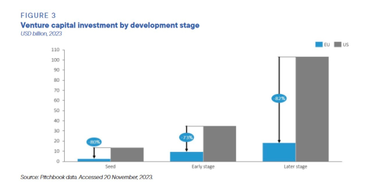 Ale budiž. Automotiv je pořád jen jeden výsek ekonomiky a můžeme ho teoreticky nahradit. O dost horší je, že starý kontinent je patrně starý i mentálně a nejsme schopni tu dávat dostatečné investice do inovativních startupů, které by nám zajišťovaly konkurenceschopnost v příštích dekádách. Rozdíl mezi USA a námi je opět propastný, nehledě na fázi investic.