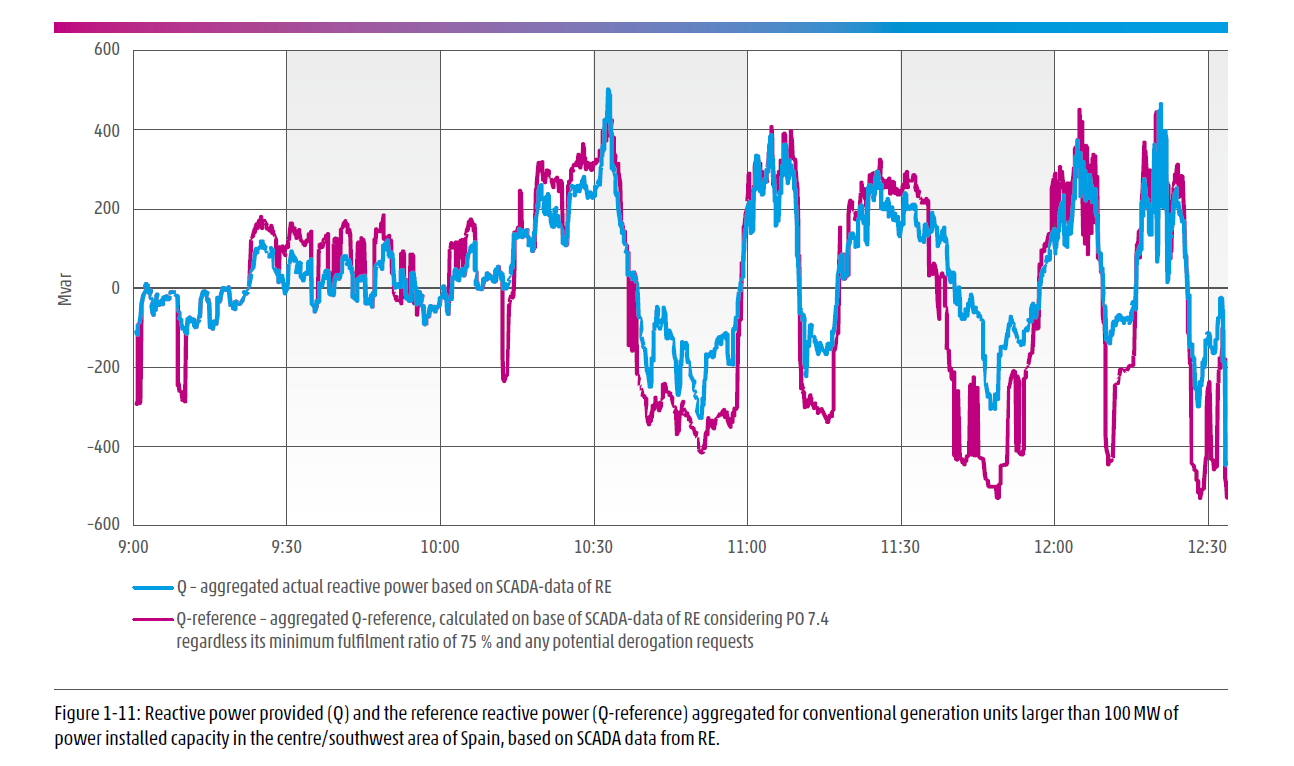 Zde je pro ilustraci regulace jalového výkonu konvenčními zdroji nad 100 MW ve střední a jihozápadní části Španělska. Modrá = co bylo reálně dodáno, fialová = co provozovatel soustavy požadoval.