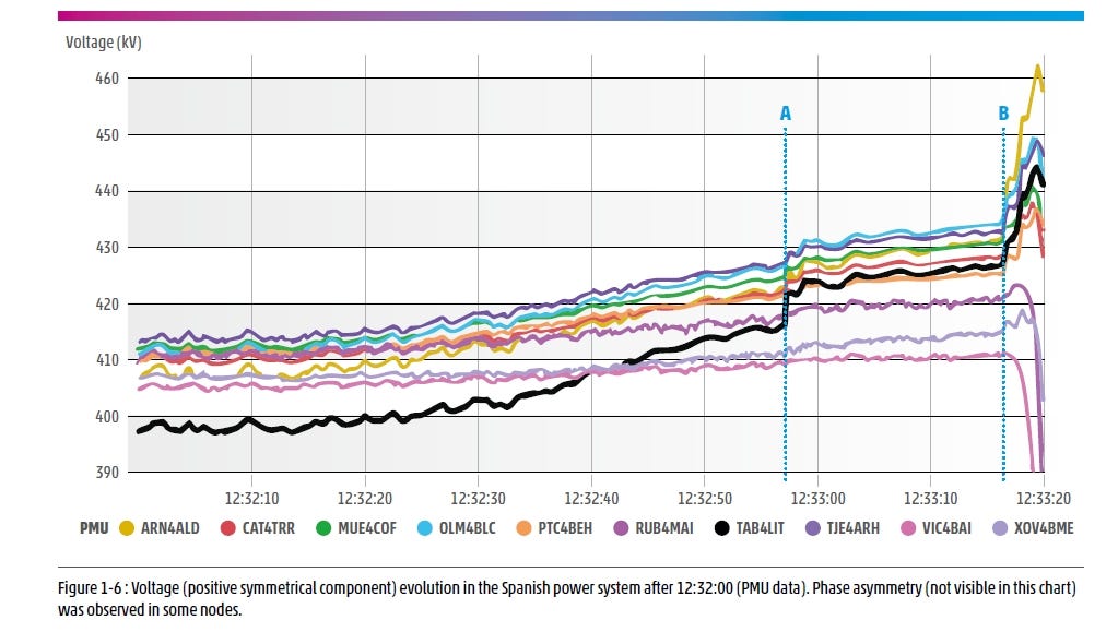 Je třeba přiznat, že prvotní výpadky neměly jednu konkrétní příčinu a že u řady z nich se ji ani nepodařilo identifikovat. Jistě víme jen to, že už v této fázi hrálo důležitou roli přepětí. Přepěťová ochrana například vyřadila klíčový transformátor v Granadě. Po 12:33:17 už pak zejména v jižním Španělsku začalo stoupat napětí tak dramaticky, že se postaralo o naprostou většinu zbývajících výpadků. Čímž vznikl začarovaný kruh, protože s každým dalším ztraceným megawattem klesala i schopnost soustavy absorbovat jalový výkon a napětí rostlo dál a dál.