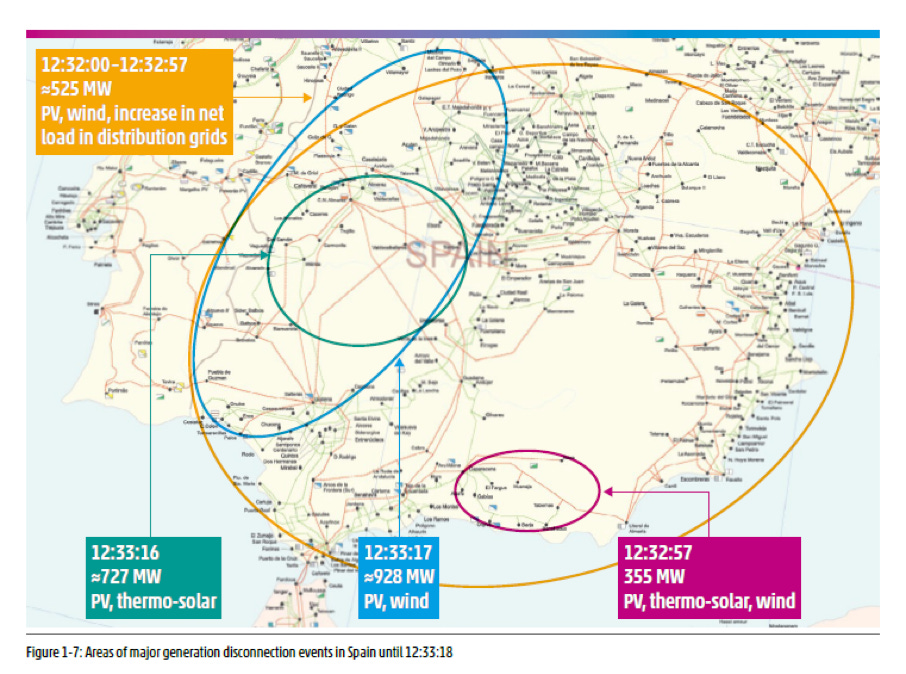 V rozmezí 12:32:00-12:32:57 vypadly napříč Španělskem pozemní i domácí fotovoltaiky a větrníky o výkonu 525 MW. Poté se poroučelo dalších 355 MW fotovoltaik, termosolárů a větrníků ve východní Andalusii. Ve 12:33:16 následoval výpadek 727 MW fotovoltaik a termosolárů v západní Andalusii a o vteřinu později zmizelo 928 MW ve fotovoltaice a větrnících v širším území táhnoucím se od Madridu k Seville.